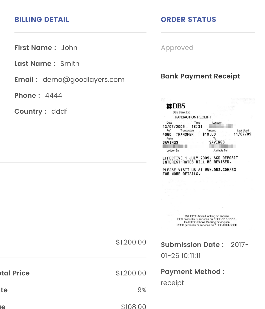After clicking on the ‘Book and pay later’ button, customer will be able to see the transaction in the backend. There’re two buttons, Submit Payment Receipt and Make An Online Payment.
